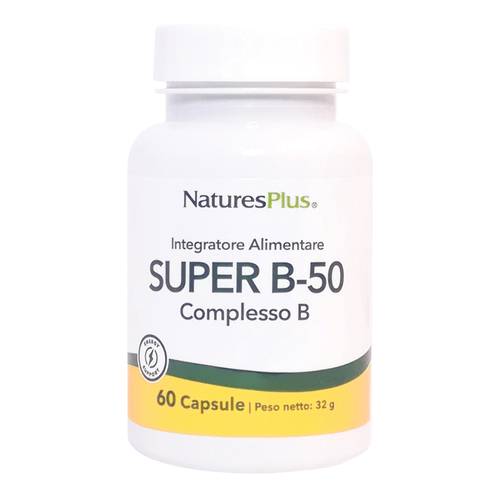 Nature's Plus SUPER B-50 Complemento alimentare di vitamine del complesso B formulato per soddisfare il fabbisogno quotidiano. Prodotto ipoallergenico e vegetariano. Non contiene: lievito, frumento, mais, soia.