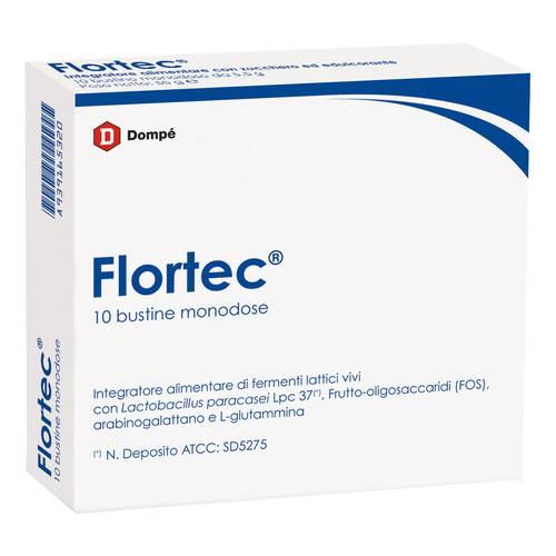Integratore alimentare simbiotico costituito da una associazione sinergica di Lactobacillus paracasei B21060 (componente probiotica) con arabinogalattano, frutto-oligosaccaridi (componenti prebiotici) e L-glutammina. L'azione combinata dei componenti di Flortec favorisce il riequilibrio dell'ecosistema intestinale.
