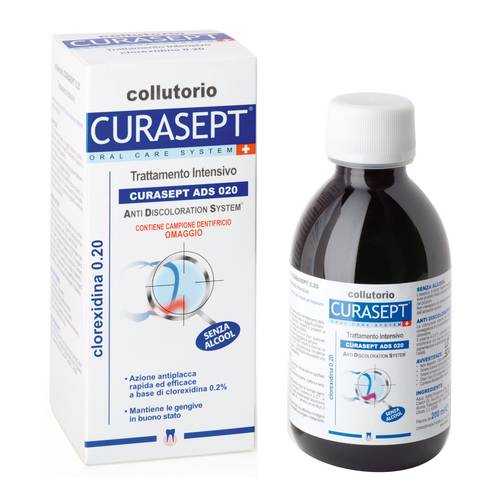 collutorio CURASEPT Trattamento Intensivo Particolarmente indicato per i portatori di protesi, impianti, apparecchi ortodontici. Grazie all'attività antiplacca può essere utilizzato anche in caso di problemi al parodonto. Ideale prima e dopo un trattamento odontoiatrico, per proteggere le gengive.
